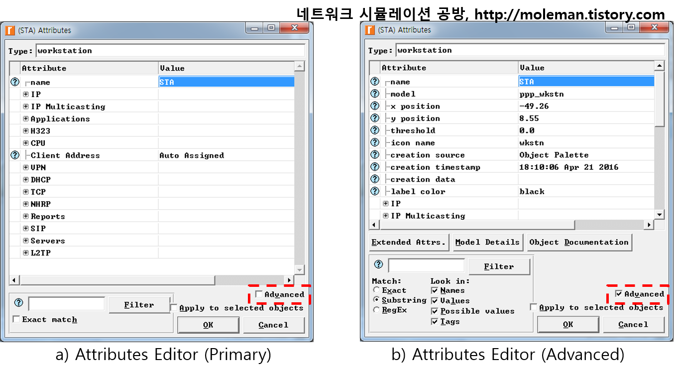 Riverbed(OPNET) Modeler 17.5 PL3 ~ 18.5.0 버전에서는 노드 속성(Attribute) 편집창이 기본적으로 Advanced 모드로 열리는 문제가 있다. Advanced 모드에서는 다음 그림처럼 자주 사용되지 않는 속성 항목들(예: model, x position, y position, threshold, icon name, creation source, creation timestamp, creation data, label color, altitude modeling, condition, financial cost, hostname, minimized icon, role)도 모두 보여지게 되므로, 많은 경우에 오히려 사용하기 불편하다.