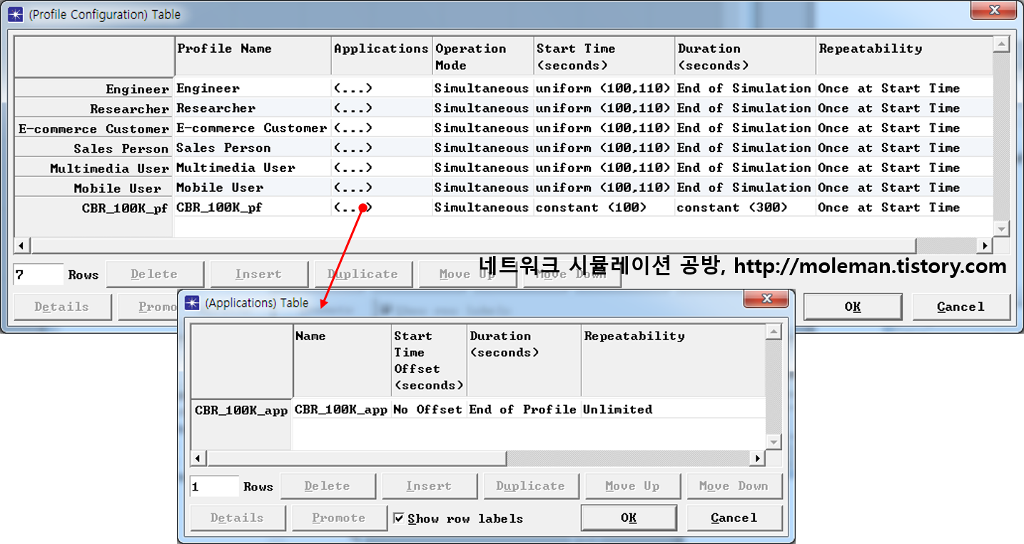 그런데, 네트워크에 부가되는 트래픽은 어플리케이션의 특성에 의해서도 변하지만,어플리케이션들이 단말에서 어떤 패턴으로 사용되는가에 따라서도 크게 영향을 받는다. 이러한 어플케이션 사용 패턴은 Riverbed(OPNET) Modeler에서 어플리케이션 타이밍에 대한 정의와 프로파일 타이밍에 대한 정의를 통해 모델링된다. 어플리케이션 타이밍은 어플리케이션 자체에 대한 사용 패턴 설정이며, 프로파일 타이밍은 이러한 어플리케이션들의 모음에 대한 사용 패턴 설정이다. 다음 그림은 어플리케이션과 프로파일의 관계를 보인 것이다.