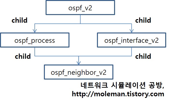 Riverbed(OPNET) Modeler에서 OSPF 프로토콜 기능은 여러 개의 프로세스 모델로 분할되어 수행된다. 다음 그림은 관련 프로세스 모델간의 생성 관계를 나타낸 것이다. 이해하기 쉽도록 가상 인터페이스(Virtual Interface) 프로세스 모델은 생략하였다.