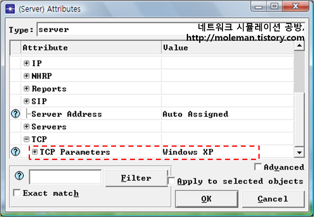 Riverbed(OPNET) Modeler TCP 모델에서는 매우 많은 수의 속성들을 제공하고 있으며, 이러한 속성들을 모두 사용자가 정확히 이해하고 값을 정확히 설정하기에는 상당한 시간이 걸릴뿐만 아니라 매우 번거롭다. 이러한 어려움을 해결하기 위하여, Riverbed(OPNET) Modeler에서는 TCP 버전 및 OS별로 속성값들이 조정된 TCP 프로파일을 제공한다. TCP 프로파일은 다음 그림처럼 TCP Parameters 속성에서 선택할 수 있다.