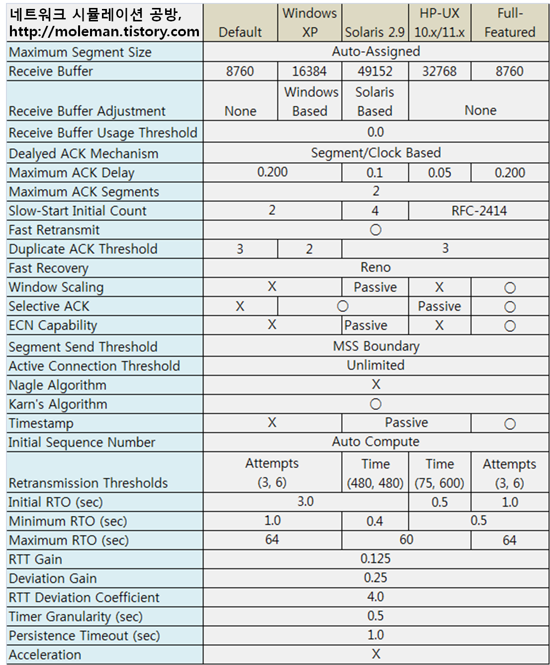 16.1 버전에서 제공되는 TCP 프로파일은 Default, Tahoe, Reno, New Reno, SACK, NT (3.5/4.0), Windows 98, Windows 2000, Windows XP, Solaris 2.6, Solaris 2.7, Solaris 2.8, Solaris 2.9, HP-UX 10.x/11.x, Full-Featured 이며, 자주 사용되는 프로파일의 세부 속성항목들의 값은 다음 표와 같다.
