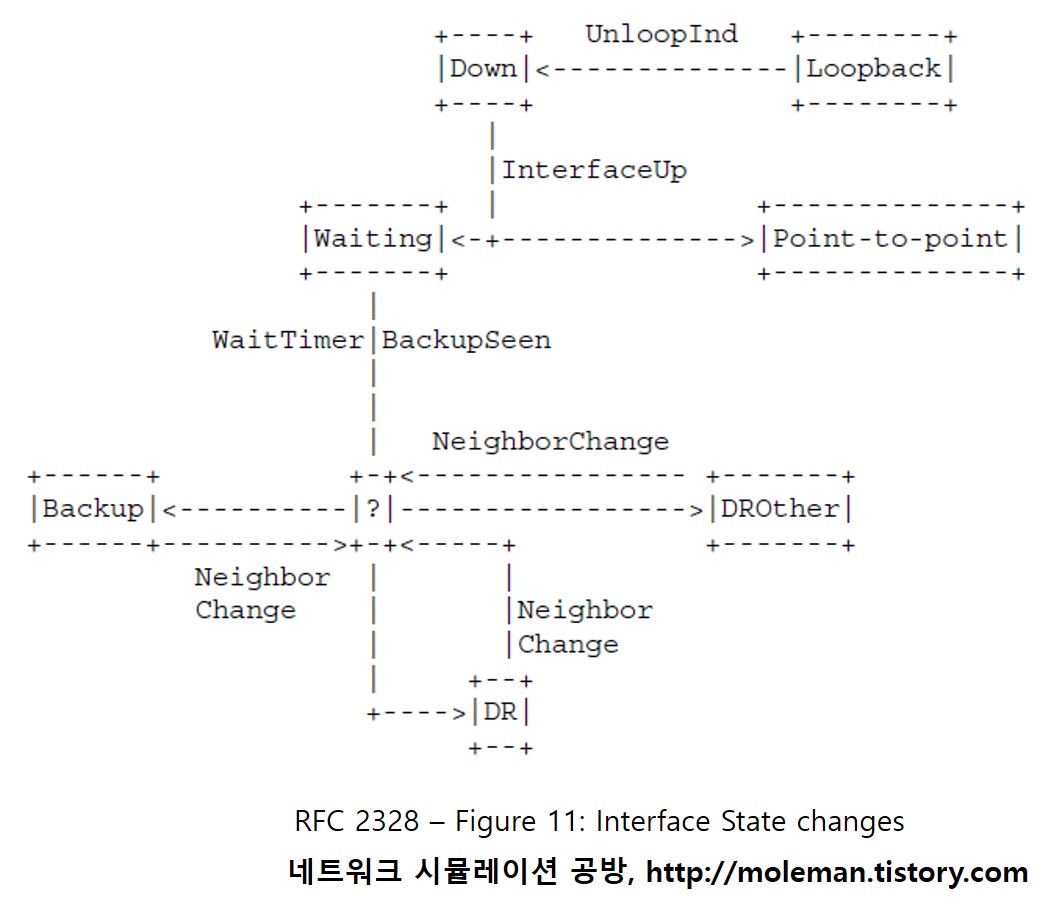 OSPF에서 인터페이스는 Down, Loopback, Waiting, Point-to-point, DR Other, Backup, DR 상태중 하나의 상태를 가지며[1, 2], "OSPF DR(1) - 라우터 상태"에서 살펴본 것처럼 Riverbed(OPNET) Modeler OSPF 모델에서도 인터페이스 상태 변화/관리 기능을 제공한다.