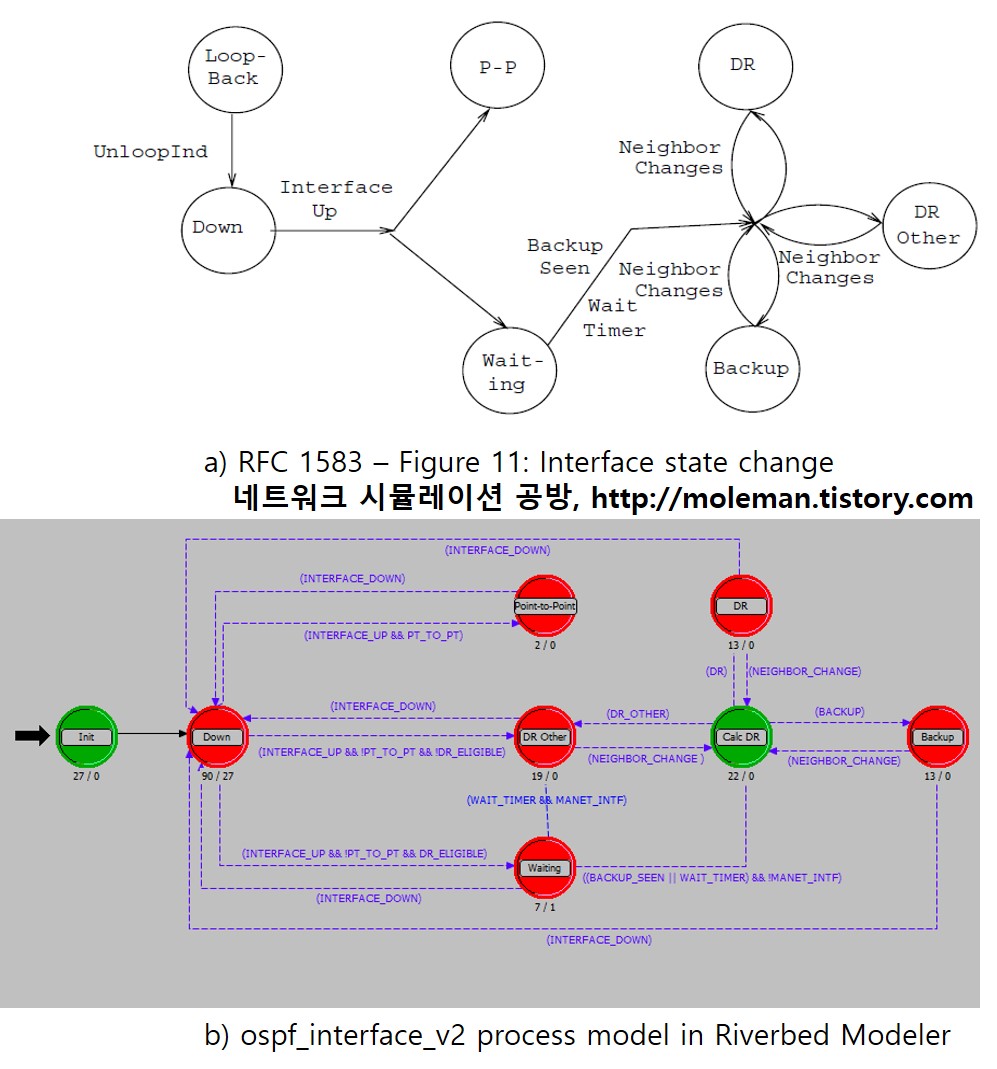 다음 그림은 표준[2]에 기술된 인터페이스 상태 변화도와 Riverbed(OPNET) Modeler OSPF 모델에 구현된 해당 프로세스 모델(ospf_interface_v2, "OSPF 프로세스 모델 구조" 참조)의 state diagram을 비교하여 나타낸 것이다.