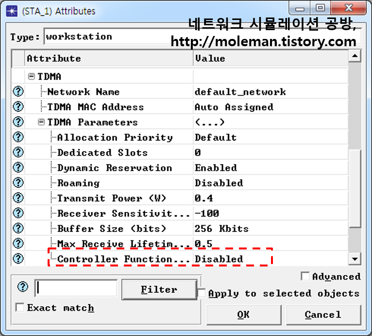 어느 노드가 네트워크 제어기로 동작할지의 여부는 사용자 설정에 따른다. 다음 그림은 사용자가 TDMA 네트워크 제어기 동작 여부를 설정할 수 있도록 Riverbed(OPNET) Modeler에서 제공하는 속성 설정창을 보인 것이다. 하나의 TDMA 네트워크에는 한개의 네트워크 제어기만 동작하여야 하며, 복수 개의 네트워크 제어기가 동작하도록 설정해서는 안된다.