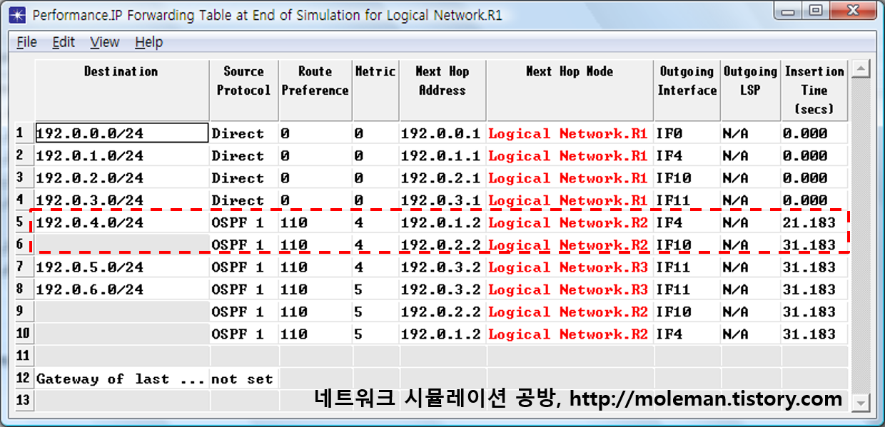 시뮬레이션을 수행한 후 R1 노드에서 구성된 라우팅 테이블을 살펴보면 다음 그림과 같다. "OSPF 라우팅 예제"에서의 결과와는 달리 R2 - R4 네트워크로 향하는 경로가 2개이며, 두 경로의 차이점은 R2 노드와 연결된 포트가 다른 것임(즉, 다중링크가 사용되고 있음)을 알 수 있다.