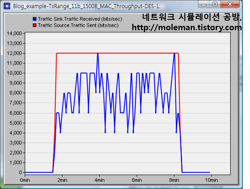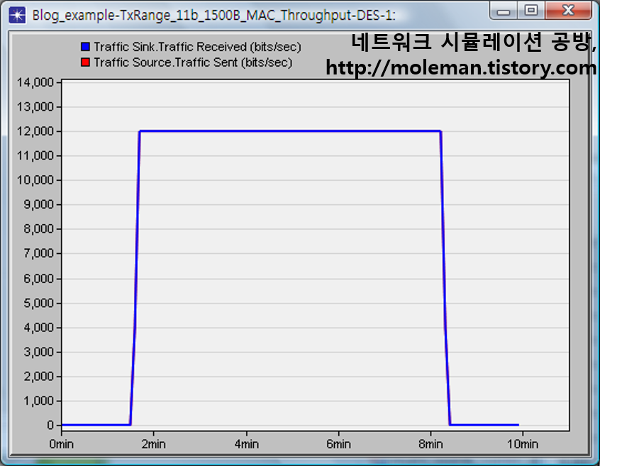 이제 시뮬레이션을 통해 이 예측을 확인해 보자. 2대의 WLAN 터미널 스테이션 노드를 배치하고, Physical Characteristics은 "Direct Sequence"로, Data Rate (bps)는 "11Mbps"로 설정한다. 트래픽은 1,500Bytes 크기의 패킷을 1초마다 발생시켜 다른 WLAN 터미널 스테이션 노드로 전송하도록 설정하였다.