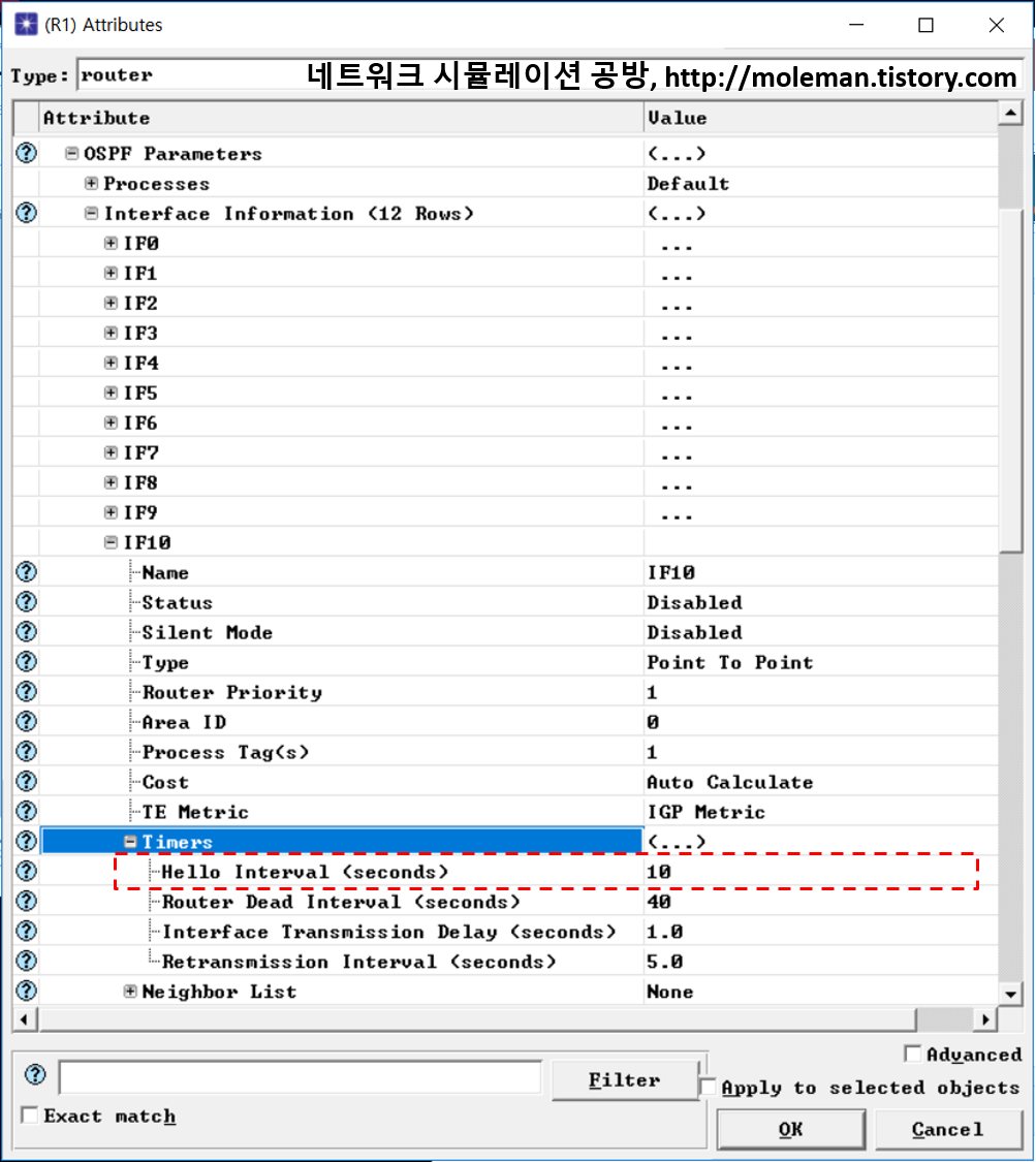 OSPF Model에서 Hello 메시지("OSPF 메시지(2) - Hello 패킷 정보 확인" 참조)가 전송되는 간격은 기본적으로 "Hello Interval (sec)" 속성에 의해 지정된다. "Hello Interval (sec)"의 기본값은 10(초)이다.