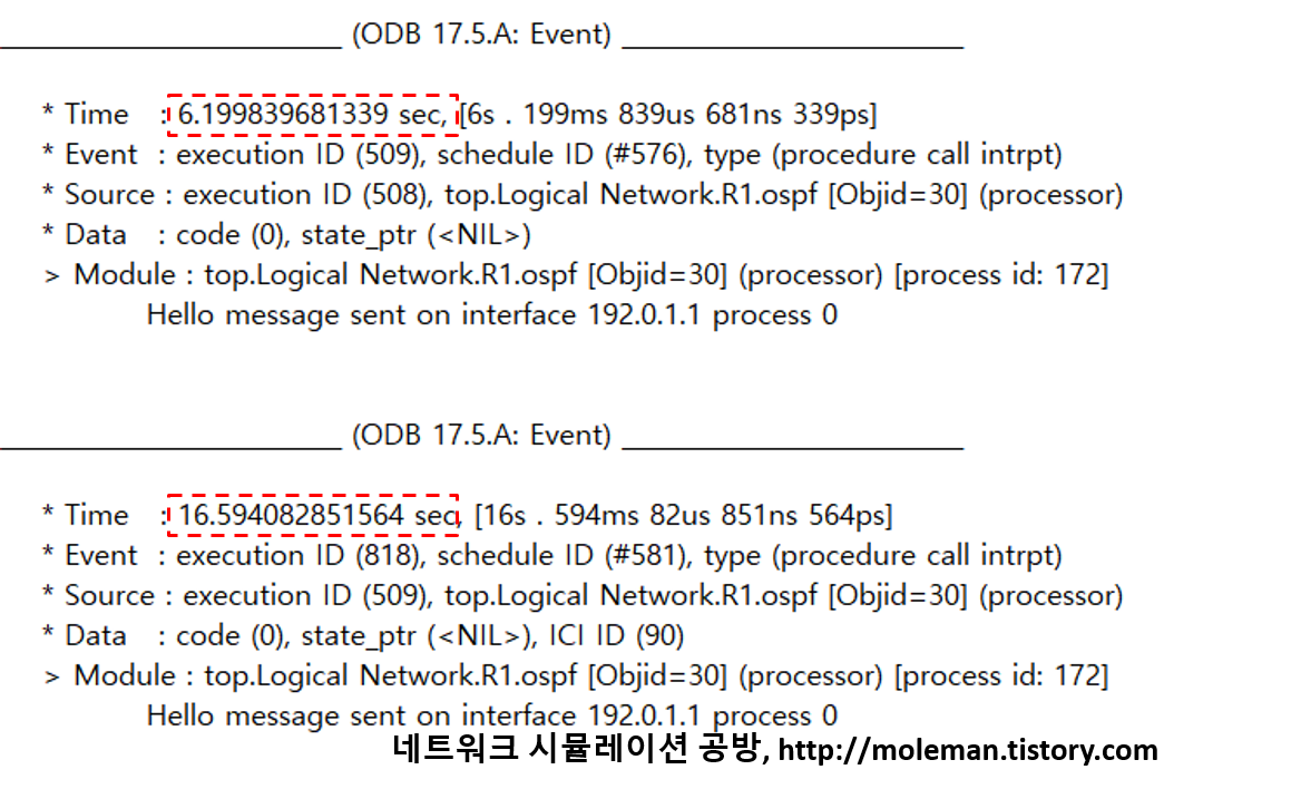 실제로 Hello 메시지가 이 시간 간격마다 전송되는 것을 예제를 통해 확인해보자. 다음 그림은 "OSPF DR(5) - 메시지 Encapsulation"에서 사용한 시험망의 R1 노드에서 전송하는 Hello 메시지 간격을 살펴본 것이다.