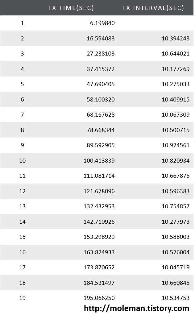 OSPF Model에서 실제로 Hello 메시지가 전송되는 간격은 Hello Inteval 값과 정확히 일치하지 않는다("Hello Interval" 참조). 다음은 이를 확인하기 위하여 "Hello Interval" 예제에서 실제로 Hello 메시지가 송신된 간격을 표로 정리한 것이다.