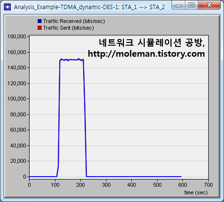 STA_1 노드에서 STA_2 노드로 향한 트래픽의 송수신량을 살펴보면 다음 그림과 같다. STA_1 노드에서 발생한 트래픽이 STA_2 노드로 모두 전달되었음을 보여준다.