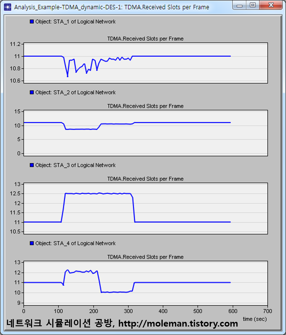 시뮬레이션을 수행한 후, 각 노드에서 할당받은 프레임당 슬롯수를 살펴보면 다음 그림과 같다. 노드별 슬롯 할당 수를 지정해주지 않았지만 노드별로 슬롯 할당이 이루어지고 있으며, 특히 100초 ~ 300초 구간의 STA_3 노드처럼 특정 시간대에 전송해야할 트래픽이 많은 노드에 슬롯이 더 많이 할당된 것을 알 수 있다.