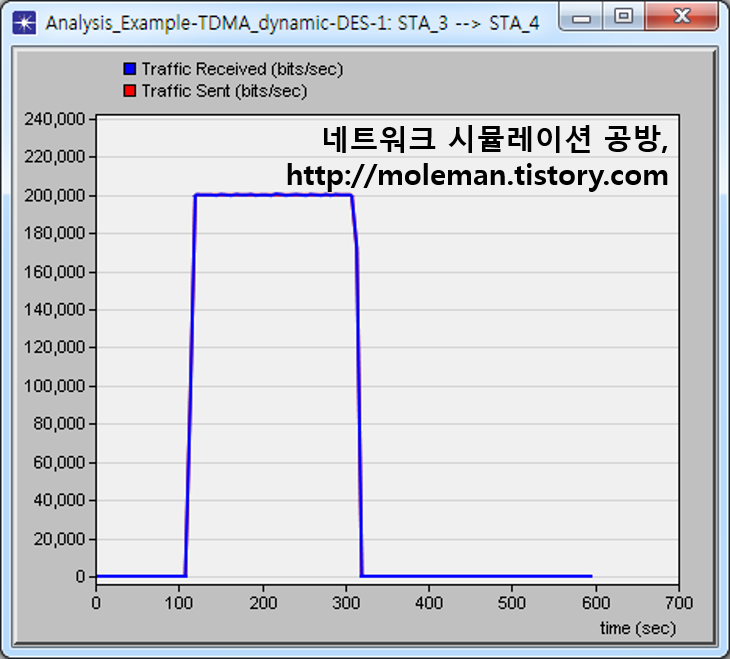 STA_3 노드에서 STA_4 노드로 향한 트래픽의 송수신량을 살펴보면 다음 그림과 같다. STA_3 노드에서 발생한 트래픽(200Kbps)도 STA_4 노드로 모두 전달되었음을 보여준다.
