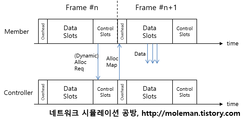TDMA 네트워크에서 데이터 전송을 위해서는 슬롯을 할당받아야만 하며 다음 그림은 그 절차를 보인 것이다. (논리적인 이해를 돕기위해 전파지연 시간은 무시하였다.)
