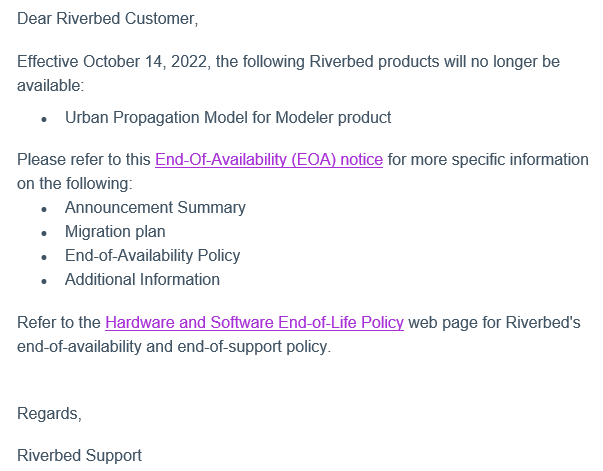 Riverbed Modeler의 Urban Propagation Model에 대한 제공 중단이 지난 10월15일자로 아래와 같이 공지되었습니다.