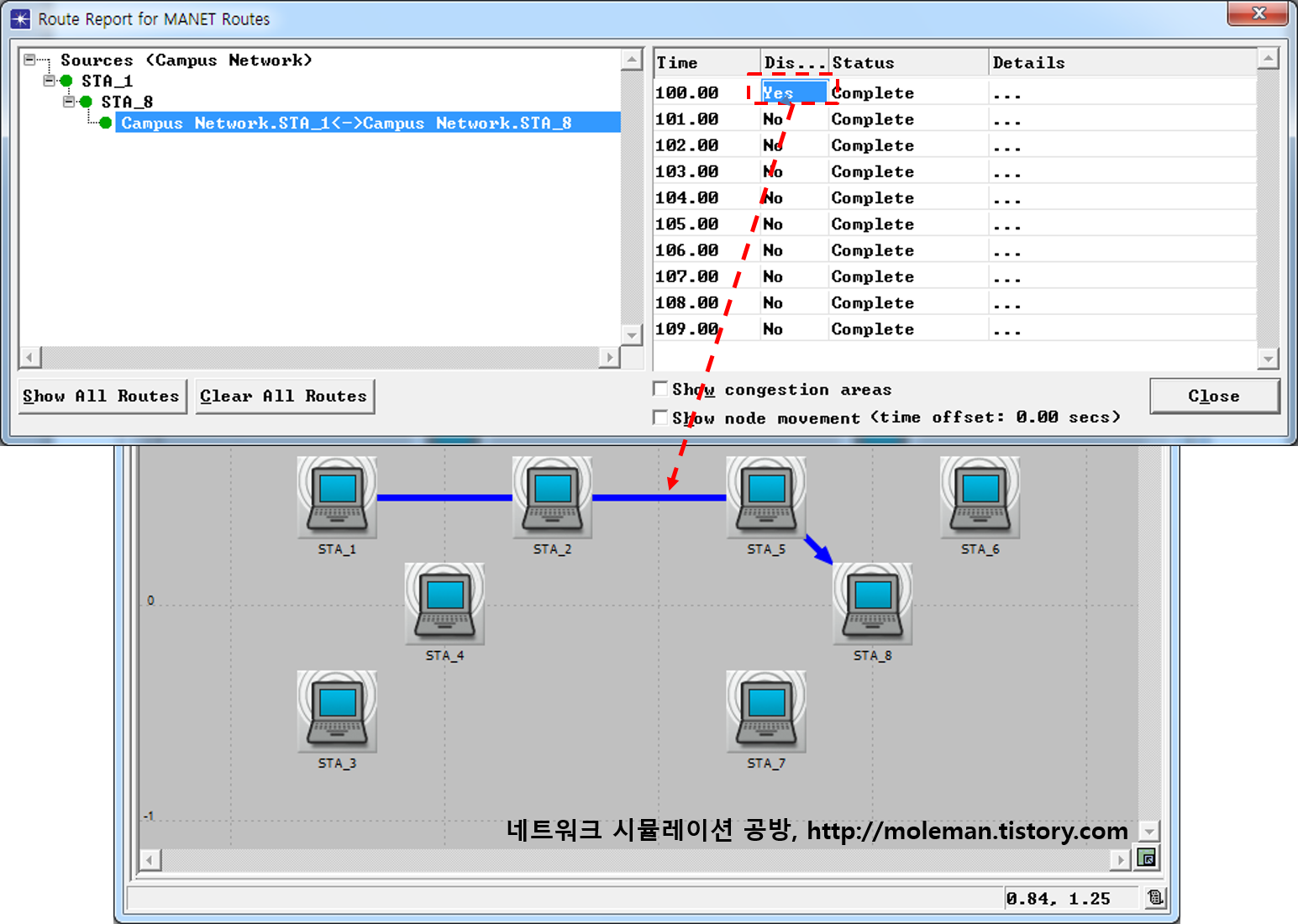 그런데, ODB를 사용하여 데이터 패킷이 각 노드를 거쳐 전달되는 과정을 자세하게 추적해보면, 실제로는 다음 그림과 같이 STA_1 -> STA_4 -> STA_1 -> STA_2 -> STA_4 -> STA_2 -> STA_5 -> STA_7 -> STA_13 -> STA_16 경로를 거쳤음을 보여준다.