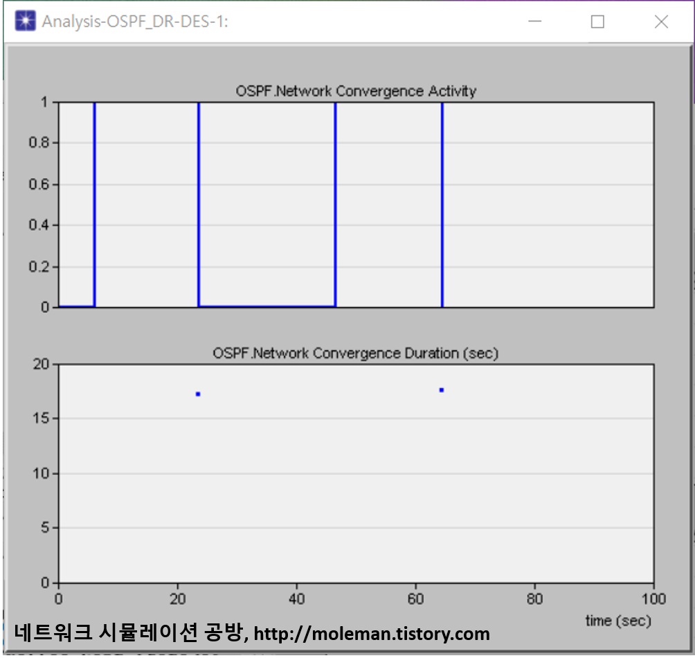 "Network Convergence Activity"와 "Network Convergence Duration" 결과값은 별도의 메커니즘을 통해 계산되는 것은 아니며, 각 노드의 OSPF "Router Convergence Activity"와 "Router Convergence Duration (sec)" 결과 항목값이 취합되어 기록된 것이다. Node Statistics의 OSPF 그룹에 속한 "Router Convergence Activity" 결과 항목에 대한 설명을 살펴보면 다음과 같다. Convergence activity가 없는 구간에서는 0, 있는 구간에서는 1이 기록된다는 것을 알 수 있다. (Convergence acvitity란 LSA 수신/생성을 의미한다.) ================================================== Records a square wave alternating between ordinates 0 and 1. It is 0 during the time interval in which no sign of convergence activity is detected; it is 1 during the time interval in which there are signs of convergence activity. ==================================================