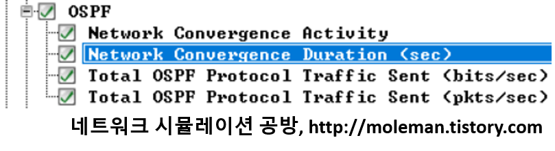 역시 Node Statistics의 OSPF 그룹에 속한 "Router Convergence Duration (sec)" 결과 항목에 대한 설명을 살펴보면 다음과 같다. OSPF 라우팅 테이블이 수렴하는데 걸린 시간이 기록되며, 이 때의 수렴 시간(Convergence Time)이란 첫 번째 Convergence activity 발생시점으로부터 해당 convergence activity 이후 일정 간격 동안 convergence activity가 없는 특정 convergence activity 발생시점까지의 경과시간을 의미한다는 것을 알 수 있다. ================================================== Records the time it takes the OSPF routing table on this router to convergence. The convergence time is the time elapsed since a first sign of convergence activity occurs (initially, or with each new disturbance) until the a sign of convergence activity occurs that is followed by a certain interval of no convergence activity. In this case, we take a sign of convergence activity to mean a recomputation of the OSPF routing table. ==================================================